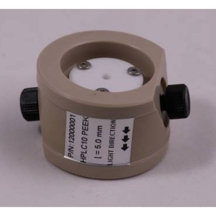 Analytical flow-cells PEEK HPLC10 and HPLC09 have a unique design with an optical length of 5 or 10 mm. Theier desing allows to use them in TOY and BABY detectors also for for analytical applications. Cells are connected via tubing with OD 1/16" and thread UNF 10-32 . The internal volume of the analytical cells is 8 or 16 µl. The maximum flow rate is 50 ml/min