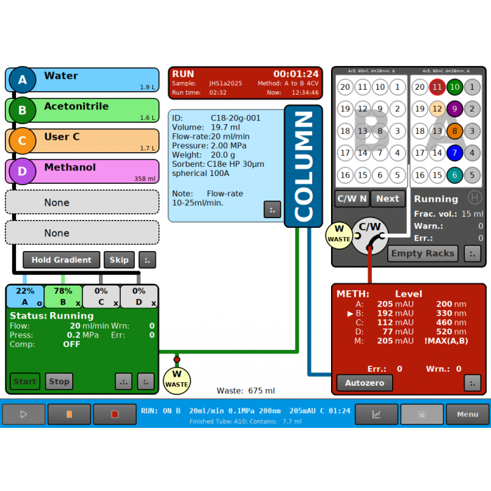 Controlling: System PC information: An industrial PC with a 4-core processor is installed. It runs on the Linux operating system and has a 12.1“ touchscreen with a resolution of 1024 × 786. The QUEEN software controls the gradient, flow rate, wavelengths, fraction collection, etc. The user gains full control with detailed results and the option of remote administration.