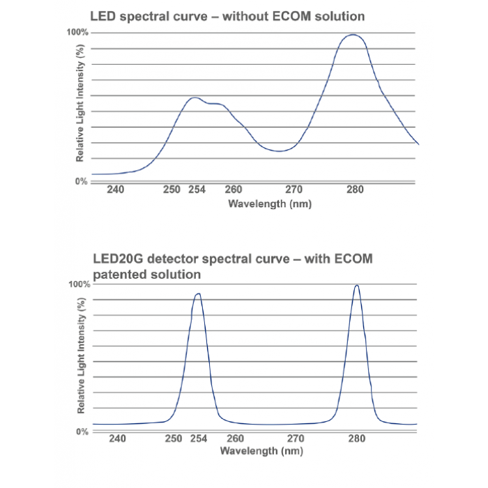 The LEDs themselves typically have a peak wavelength with a tolerance of +/- 5 nm and a spectral half-width of 10-20 nm, which is unacceptable for some applications, as e.g., for FPLC. This ECOM solution, however, allows the spectral width to be narrowed and, thanks to our patented technology, the exact wavelength to be selected from the LED spectrum.