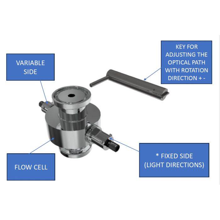 Adjustment process: The adjustment of the optical path is carried out mechanically using a special adjustment wrench which, thanks to the measuring grooves, guarantees the exact adjustment of the desired optical path and for the control of the optical path, a verification on chemical solutions is used, where the cell must achieve predetermined values of absorbance on a given solution and at a given concentration.